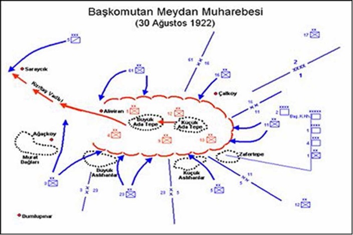 26 Ağustos 1922 sabahı saat 05.30’da Kocatepe’den verilen emirle topçu ateşi başladı. İki gün içinde Afyon’un güneyindeki düşman mevzileri düşerken, 30 Ağustos’ta Başkomutan Meydan Muharebesi ile düşmanın ana kuvvetleri imha edildi. Yunan Ordusu Başkomutanı General Trikopis esir alındı.