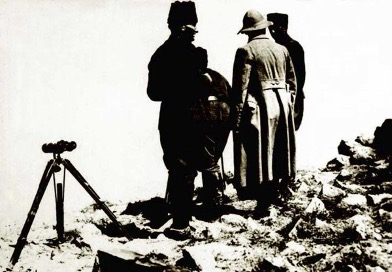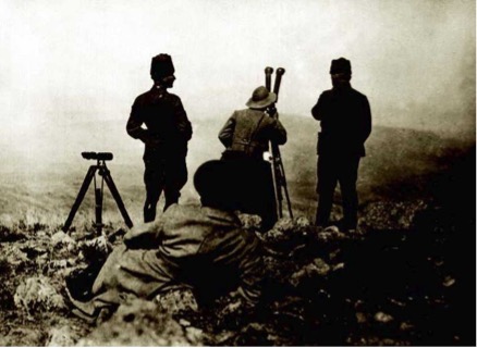 Sabah saat 05.30’da topçu ateşiyle Büyük Taarruz’un başlaması, Kocatepe, Afyonkarahisar, 26 Ağustos 1922. Dürbünle bakan şapkalı subay topçu ileri gözetleme subayı Üsteğmen Şahap (Gürler Paşa)’dır. Gelecek ışığı kırsın, net görüş sağlasın diye şapka giymiştir.
