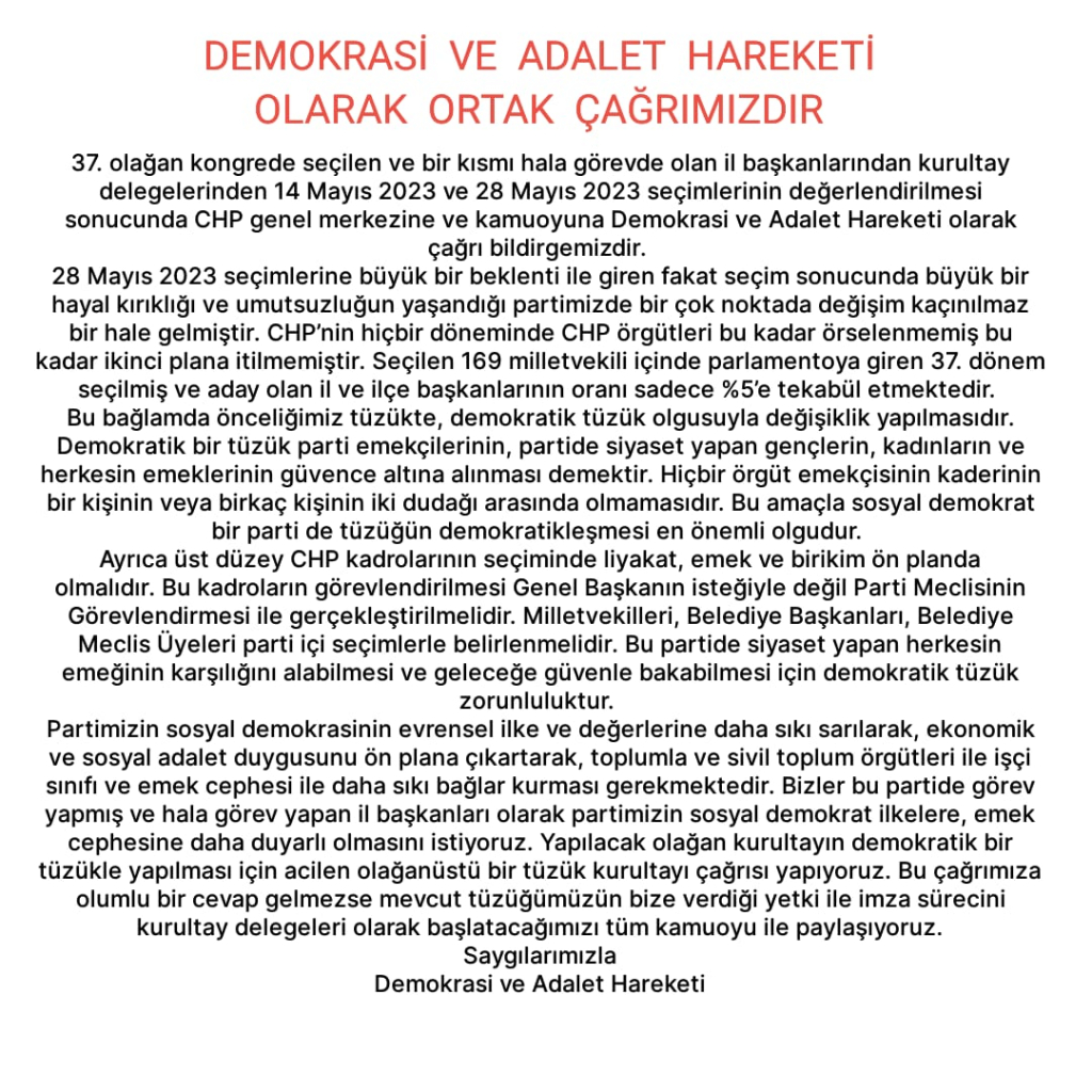 “37. olağan kongrede seçilen ve bir kısmı hala görevde olan il başkanlarından kurultay delegelerinden 14 Mayıs 2023 ve 28 Mayıs 2023 seçimlerinin değerlendirilmesi sonucunda CHP genel merkezine ve kamuoyuna Demokrasi ve Adalet Hareketi olarak çağrı bildirgemizdir.