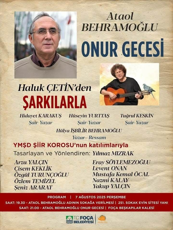 Yılın yarısına yakın bir zaman İzmir’in Foça İlçesi’nde geçiren edebiyatımızın büyük ustası Ataol Behramoğlu’nun adı 7 Ağustos 2025 Perşembe günü saat 19.30’da düzenlenecek törenle İsmetpaşa Mahallesi Mersinaki Caddesi 274. Sokağa verilecek. İlçede bulunduğu sürede kültür sanat faaliyetlerine katılan, sanat ve edebiyatla uğraşanlara destek veren ve kendisi de eserler üreten Behramoğlu için düzenlenen onur gecesi ise saat 21.00’de tarihi Beşkapılar Kalesi’nde başlayacak. Şair yazarlar Hidayet Karakuş, Hüseyin Yurttaş ve Tuğrul Keskin ile yazar ressam Hülya İşbilir Behramoğlu söyleşide eserleri ve kişiliğiyle Ataol Behramoğlu’nu anlatacaklar. Yılmaz Mızrak’ın tasarım ve yönlendiriciliğinde Arzu Yalçın, Çisem Keklik, Özgül Turunçoğlu, Özlem Temizel, Şeniz Ararat, Eray Söylemezoğlu, Levent Onan, Mustafa Kemal Öcal, Nazmi Kalay ve Yakup Yalçın’ın yer aldığı YMŞD Şiir Korosu Behramoğlu şiirlerinden örnekler sunacak. Kendisiyle yıllarca aynı sahneyi paylaşan müzisyen Haluk Çetin, Behramoğlu şiirlerinden bestelenmiş şarkılarla gönüllere seslenecek.