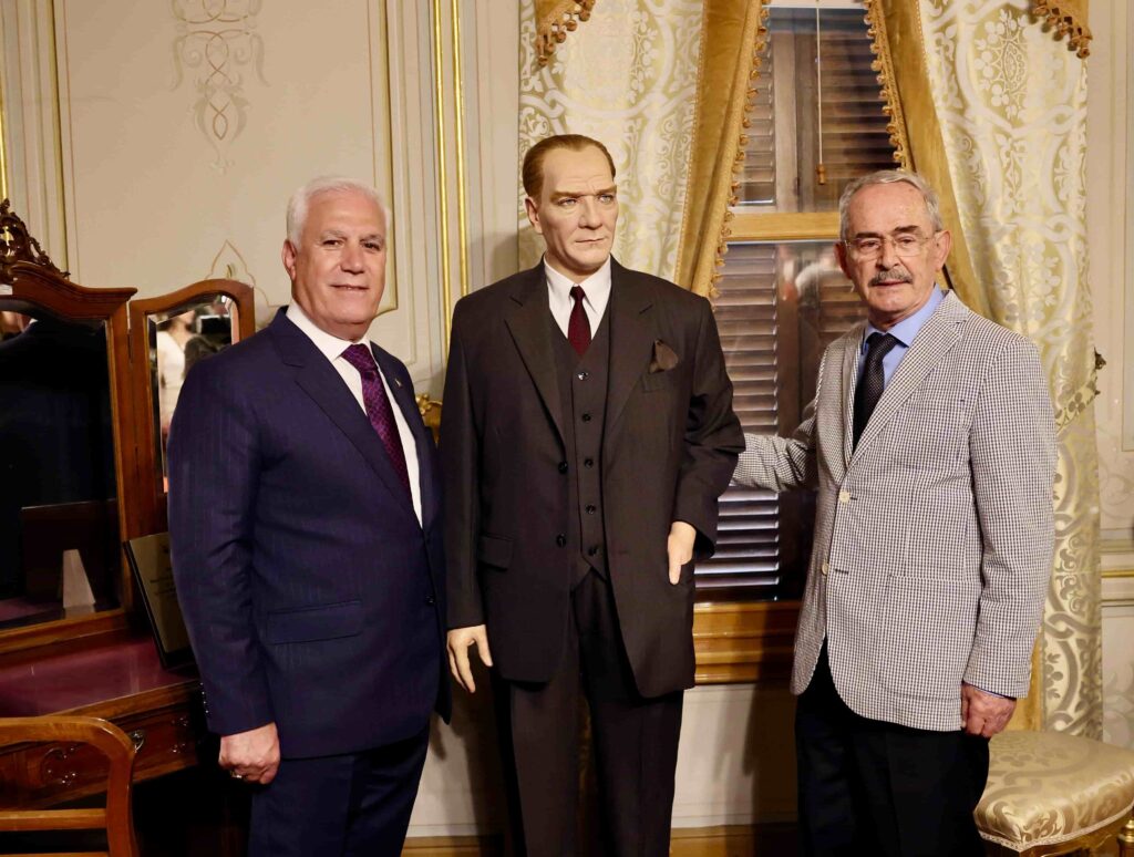 Bursa Büyükşehir Belediyesi, Cumhuriyetimizin kurucusu Ulu Önder Gazi Mustafa Kemal Atatürk’ün aziz hatırasını yaşatmak amacıyla iş insanı Çetin Topal’ın katkılarıyla ve Eskişehir Büyükşehir Belediyesi önceki dönem Belediye Başkanı Prof. Dr. Yılmaz Büyükerşen’in emekleriyle hazırlanan balmumu ‘Atatürk Heykeli’ni Hünkâr Köşkü’nde düzenlenen törenle ziyarete açtı. Gerçeğe en yakın ölçülerde hazırlanan heykel, müzenin özel bölümünde ziyaretçilerini bekliyor. Törene, Büyükşehir Belediye Başkanı Mustafa Bozbey’in yanı sıra Prof. Dr. Yılmaz Büyükerşen, iş insanı Çetin Topal, Büyükşehir Belediyesi Genel Sekreteri Doç. Dr. Ergül Halisçelik ve Büyükşehir Belediyesi yöneticileri katıldı.