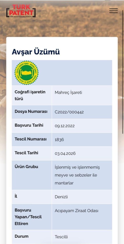 Denizli’nin Acıpayam ilçesine bağlı Avşar Mahallesi’nde yüzyıllardır özenle yetiştirilen Avşar Üzümü’nün, 3 Nisan 2026 tarihinde Türk Patent ve Marka Kurumu tarafından coğrafi işaret olarak tescil edildi. Köy muhtarı Cengiz Özcan Avşarlılar olarak bizler için büyük bir gurur vesilesi olmuştur.