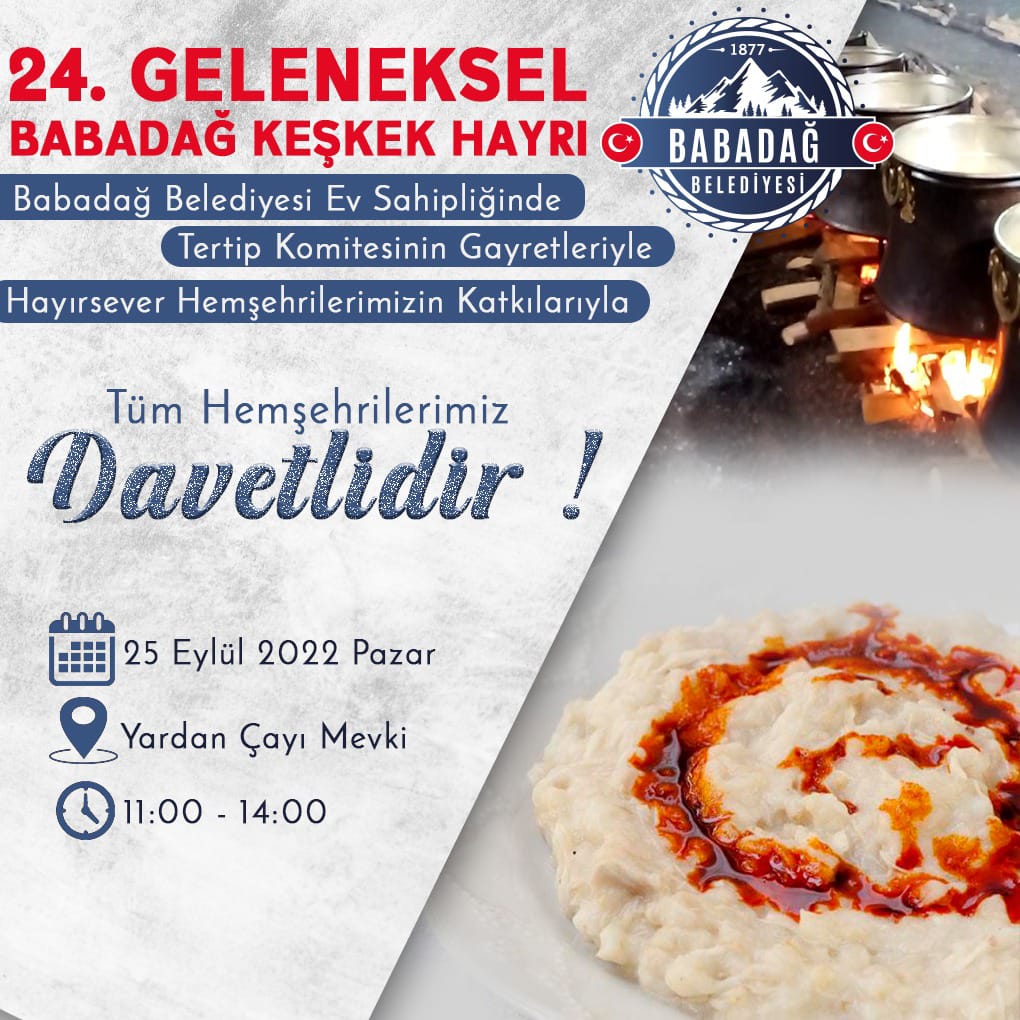 Bu sene 24.’sü gerçekleştirilecek olan Babadağ Keşkek Hayrı’yla ilgili de konuşan Babadağ Belediye Başkanı Ali Atlı “Bildiğiniz gibi önümüzdeki hafta bizim Geleneksel Karaçöplen Keşkek Hayrı’mız var. Bu sene 25 Eylül Pazar günü bu etkinliği yapmayı planlıyoruz. Şu an keşkek hayrımızla ilgili hazırlıklarımız da devam ediyor. Bu keşkek hayrında Türkiye’nin her yerinde yaşayan Babadağlı hemşerilerimiz Babadağ’a gelerek, ilçemizdeki tanıdıkları ve akrabaları ile hasret gideriyorlar. Bu bağlamda keşkek hayrının bizim için manevi bir anlamı da var. 25 Eylül tarihinde saat 11.00 ve 14.00 arası Karaçöplen olarak bildiğimiz keşkek hayrını bu sene farklı bir bölgede yaparak tamamlamayı planlıyoruz.” şeklinde konuştu.