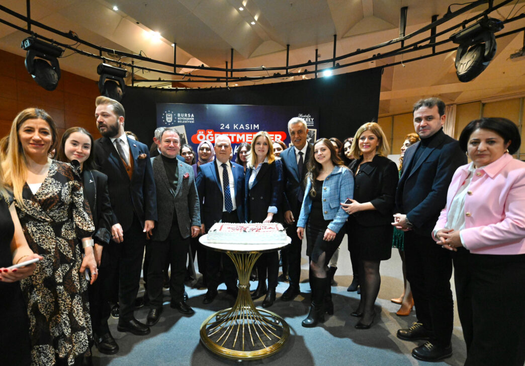 Bursa Büyükşehir Belediyesi bünyesindeki Bursa Yuvam, BUSMEK ve YKS kurslarında görevli öğretmenler, Merinos Atatürk Kongre ve Kültür Merkezi’ndeki 24 Kasım Öğretmenler Günü yemeğinde buluştu. Bursa Büyükşehir Belediye Başkanı Mustafa Bozbey ve eşi Seden Bozbey’in yanı sıra Büyükşehir Belediyesi Genel Sekreter Yardımcıları Ali Altunsoy, Mehmet Emin Direkçi ve Mehmet Yıldız, Dış İlişkiler Dairesi Başkanı Pınar Işıkyıldız ve BURFAŞ Yönetim Kurulu Başkanı Yalçın Işıkyıldız da bu özel günde öğretmenleri yalnız bırakmadı. Orkestra Şube Müdürlüğü sanatçılarının mini bir konser verdiği gecede, öğretmenler keyifli bir gün geçirdi.