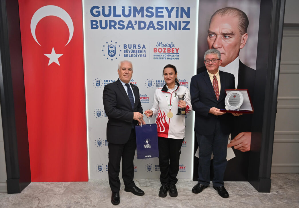 Bursa Büyükşehir Belediye Başkanı Mustafa Bozbey, 16. Dünya Briç Şampiyonası’nda dünya şampiyonu olan Türkiye Kadın Milli Takımı’nın Bursa Briç Spor Kulübü oyuncusu Dilek Yavaş’ı makamında ağırlayarak tebrik etti.