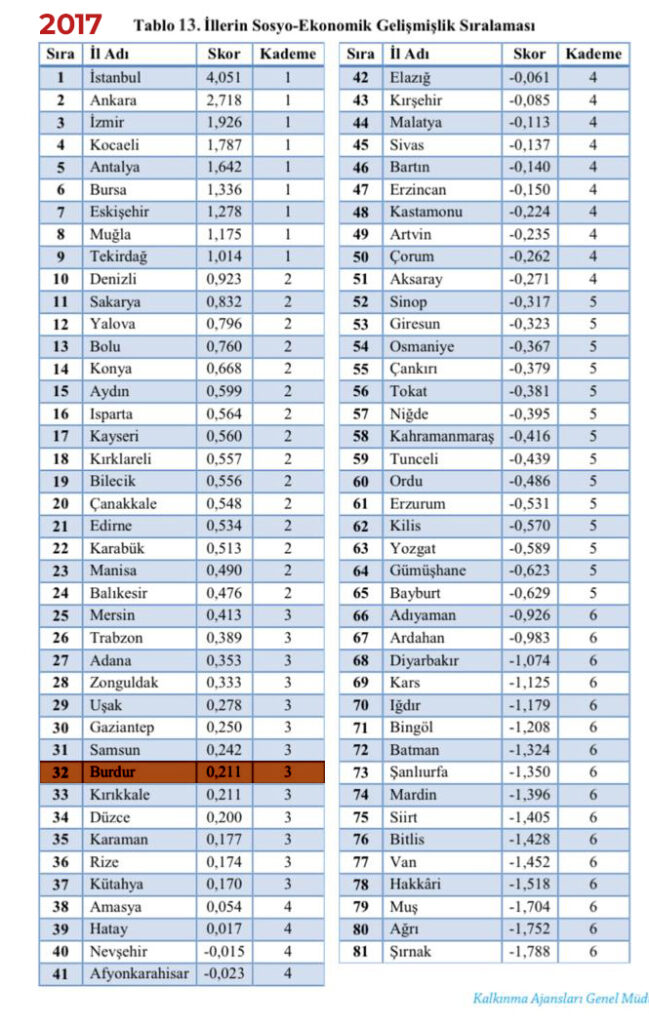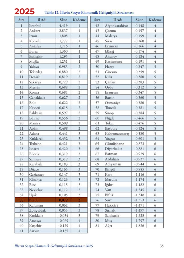 sonuçlarına baktığımızda, Burdur’un 2017 yılında 32. sırada yer alırken 2025 itibarıyla sıraya gerilediğini görüyoruz.