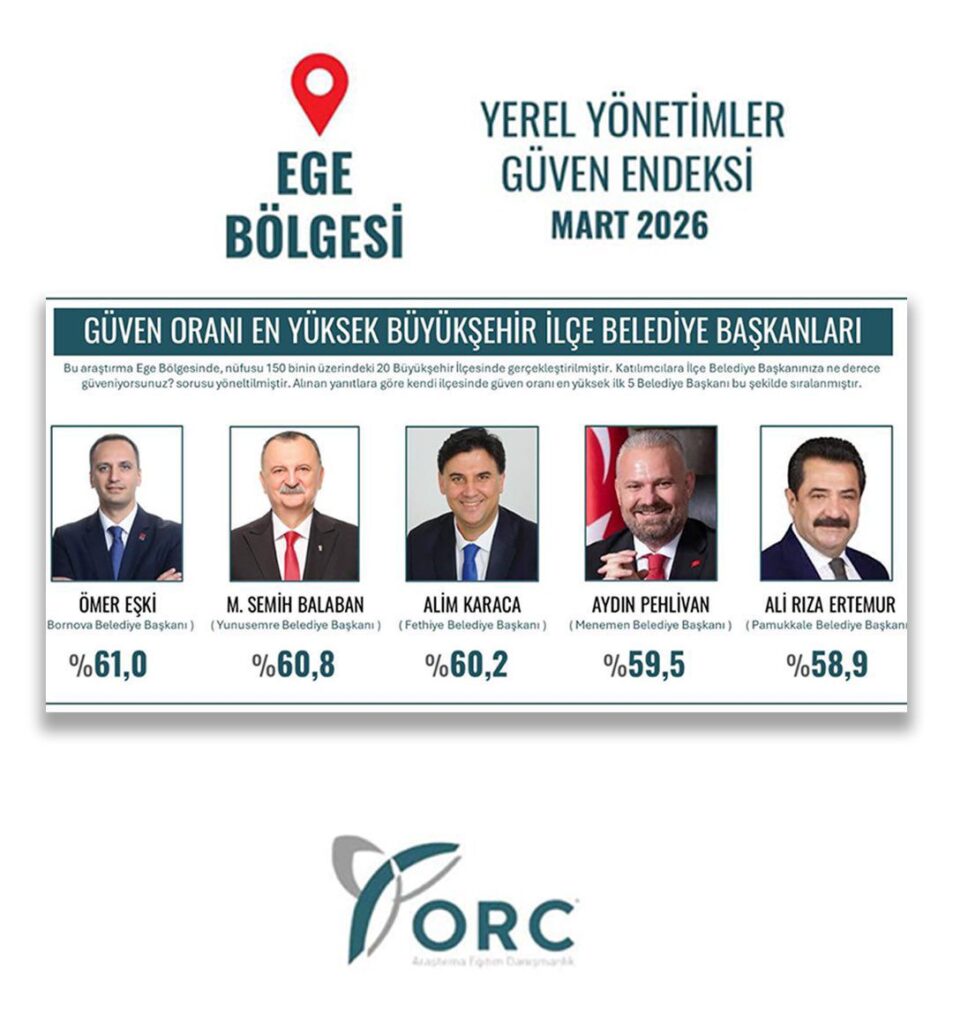 ORC Araştırma Şirketi tarafından 27 Şubat–4 Mart 2026 tarihleri arasında Ege Bölgesi’ndeki 20 ilçede gerçekleştirilen çalışmada 7 bin 200 katılımcıya, “İlçe Belediye başkanınıza ne derece güveniyorsunuz?” sorusu yöneltildi. Açıklanan sonuçlara göre Pamukkale Belediye Başkanı Ali Rıza Ertemur, yüzde 58,9’luk güven oranıyla listenin ilk 5 sırasında yer aldı.