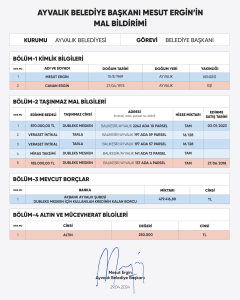 Ayvalık Belediye Başkanı Mesut Ergin, şeffaf yönetim anlayışının başkanlık makamından başlayacağı anlayışıyla güncel mal beyanını açıkladı.