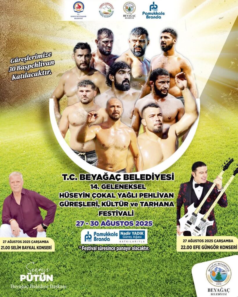 Denizli’nin Beyağaç ilçesinde, “Ege’nin Kırkpınar’ı” olarak bilinen Beyağaç Belediyesi Hüseyin Çokal Yağlı Pehlivan Güreşleri, Kültür ve Tarhana Festivali bu yıl 27 – 30 Ağustos 2025 tarihleri arasında düzenlenecek.