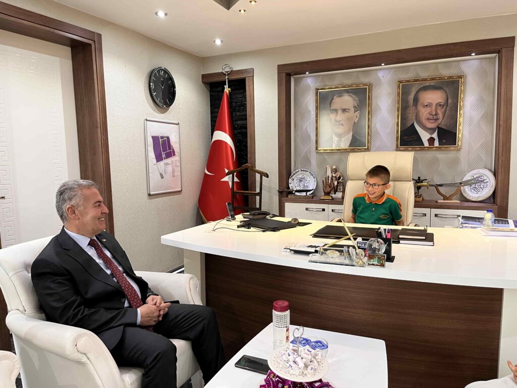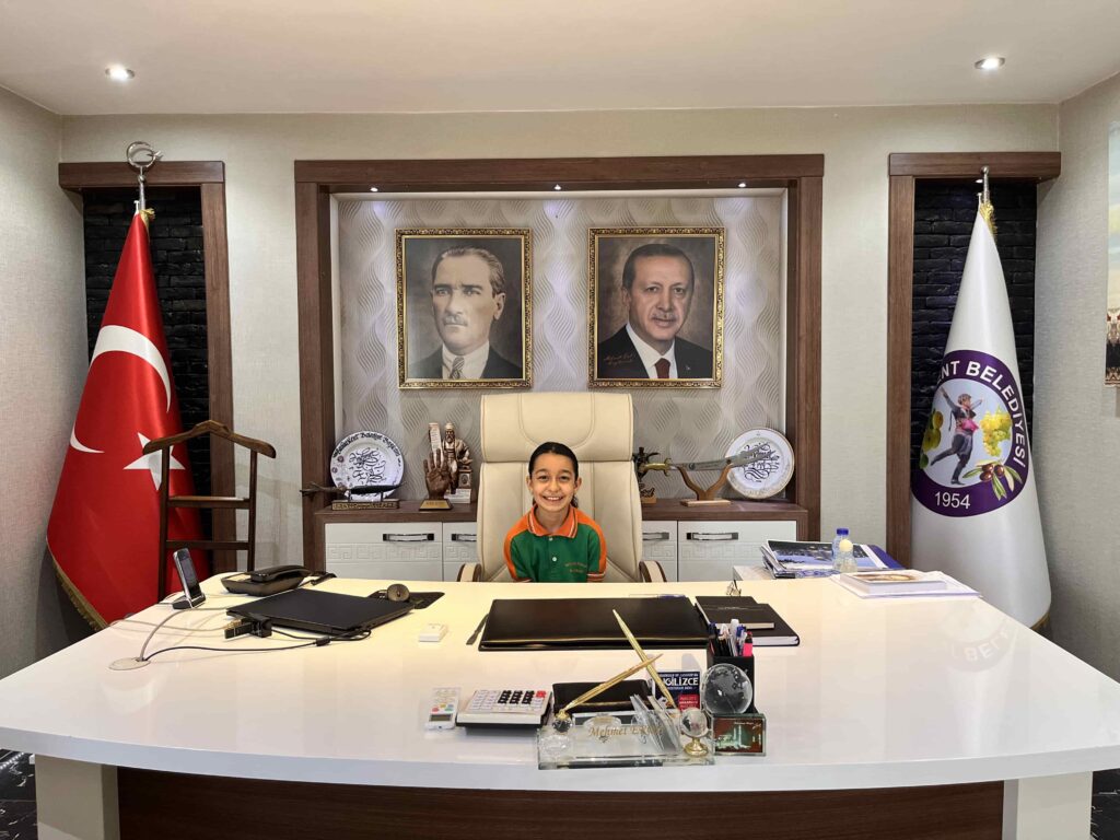 “Cumhuriyetimizin Kurucusu Gazi Mustafa Kemal Atatürk’ün çocuklarımıza armağan ettiği 23 Nisan Ulusal Egemenlik ve Çocuk Bayramı’nda başkanlık koltuğu, Kamilpaşa İlkokulu 4’üncü sınıf öğrencilerimiz Elfida Dağdelen ve Esat Aksoy’a emanet.
