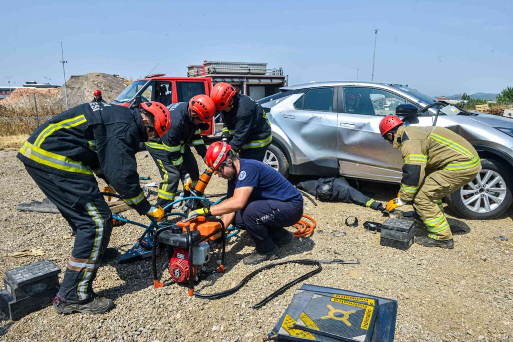 Küçükbalıklı’daki İtfaiye Eğitim Merkezi’nde yangına müdahale, arama kurtarma gibi çeşitli konularda uygulama yapılırken, senaryo gereği trafik kazası sonucu araç içinde sıkışan kazazedenin kurtarılması takibatı da gerçeği aratmadı.