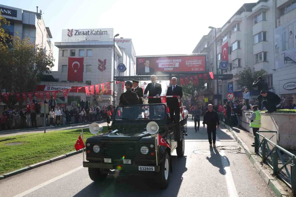 Cumhuriyet Bayramı’nın 102. yılı, Bursa Valiliği’nin Atatürk Caddesi’nde düzenlediği programla kutlandı. Vatandaşların büyük ilgi gösterdiği törene, Bursa Valisi Erol Ayyıldız, Bursa Büyükşehir Belediye Başkanı Mustafa Bozbey, Bursa Emniyet Müdürü Kadir Gökce, Bursa İl Jandarma Komutanı Tümgeneral İdris Tataroğlu, Bursa Milletvekilleri, siyasi parti temsilcileri de katıldı. İstiklal Marşı’nın okunarak Türk Bayrağı’nın göndere çekilmesinin ardından konuşan Vali Ayyıldız, vatandaşların Cumhuriyet Bayramı’nı kutladı.