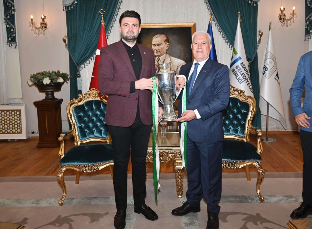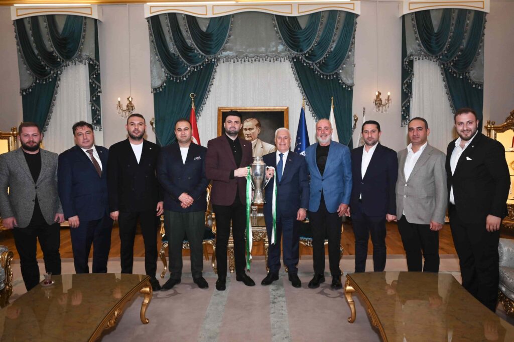 Nesine 3. Lig 1. Grup’ta şampiyonluğa ulaşarak 2. Lig’e yükselmeye hak kazanan Bursaspor’un Başkanı Enes Çelik ve yönetim kurulu üyeleri, şampiyonluk kupasıyla birlikte Bursa Büyükşehir Belediye Başkanı Mustafa Bozbey’i Tarihi Belediye Binası’nda ziyaret eti. Samimi bir ortamda gerçekleşen ziyarette, zorlu bir süreçten geçerek bir üst lige çıkmayı başaran Bursaspor’un yeni hedefleri konuşuldu.
