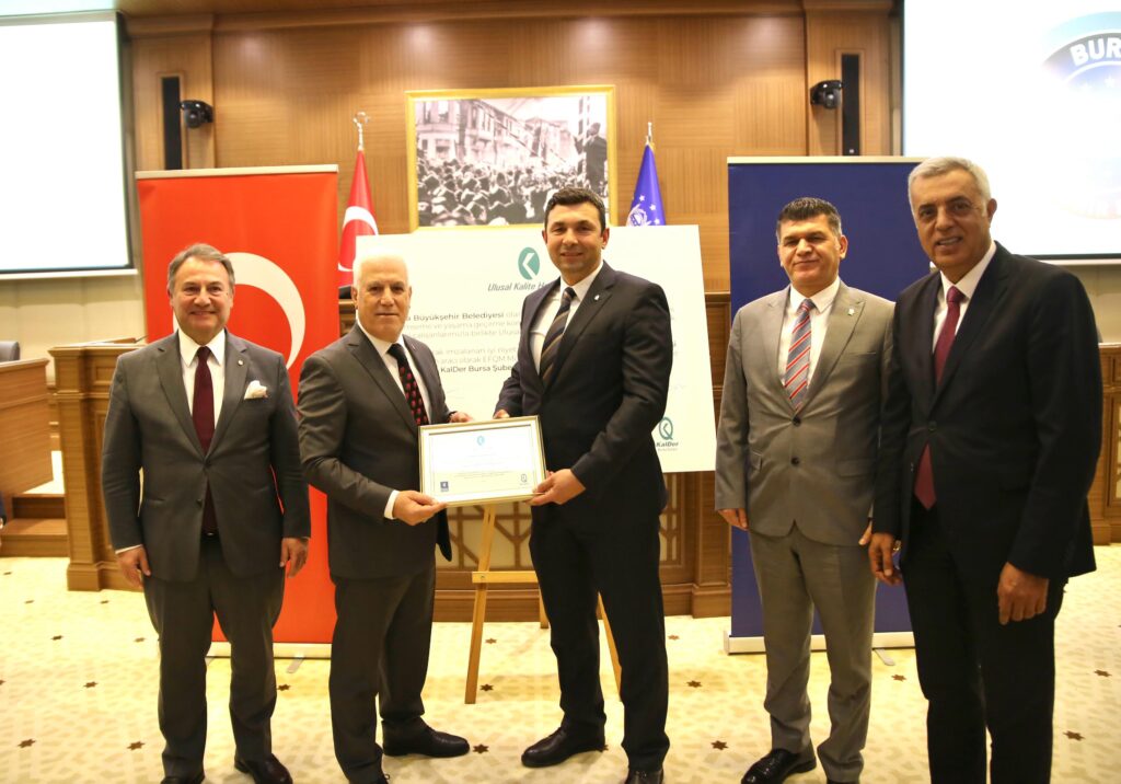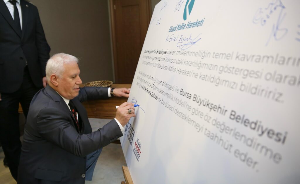 Kurumların uzun vadeli başarısını destekleyen stratejik bir yönetim sistemi olan EFQM modelini, Bursa Büyükşehir Belediyesi’nin benimsediğini ve yaşama geçireceğini simgeleyen Ulusal Kalite Hareketi İyi Niyet Bildirgesi, Bursa Büyükşehir Belediye Başkanı Mustafa Bozbey ve KalDer Bursa Şubesi Yönetim Kurulu Başkanı Serkan Ürkmez arasında imzalandı.