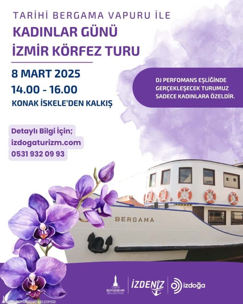 İzmir Büyükşehir Belediyesi şirketleri İZDENİZ ve İZDOĞA ortaklığında tarihi Bergama Vapuru ile Körfez’de düzenlenen turlar 8 Mart Dünya Emekçi Kadınlar Günü’ne özel programla devam edecek. Sadece kadınlara özel tur 8 Mart 2025 Cumartesi günü 14.00 ile 16.00 saatleri arasında olacak. Konak Vapur İskelesi’nden hareket edip yine aynı iskelede sona erecek tur boyunca kadınlar DJ performansı eşliğinde keyifli vakit geçirecek.