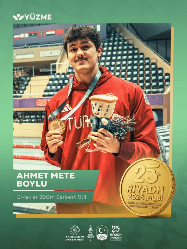 Ahmet Mete Boylu, 200 metre serbest yarışında sergilediği performansla altın madalya kazanırken, 1:48,65’lik derecesiyle de İslam Oyunları Rekoruna imza attı. Başarılı sporcu, takım arkadaşlarıyla birlikte 4×100 metre serbest bayrak, 4×200 metre serbest bayrak ve 4×100 metre serbest mix bayrak yarışlarında da altın madalya elde ederek toplam dört kez zirveye çıktı. Ayrıca 400 metre serbestte bronz madalya, 100 metre serbestte ise dördüncülükle yarışları tamamladı.