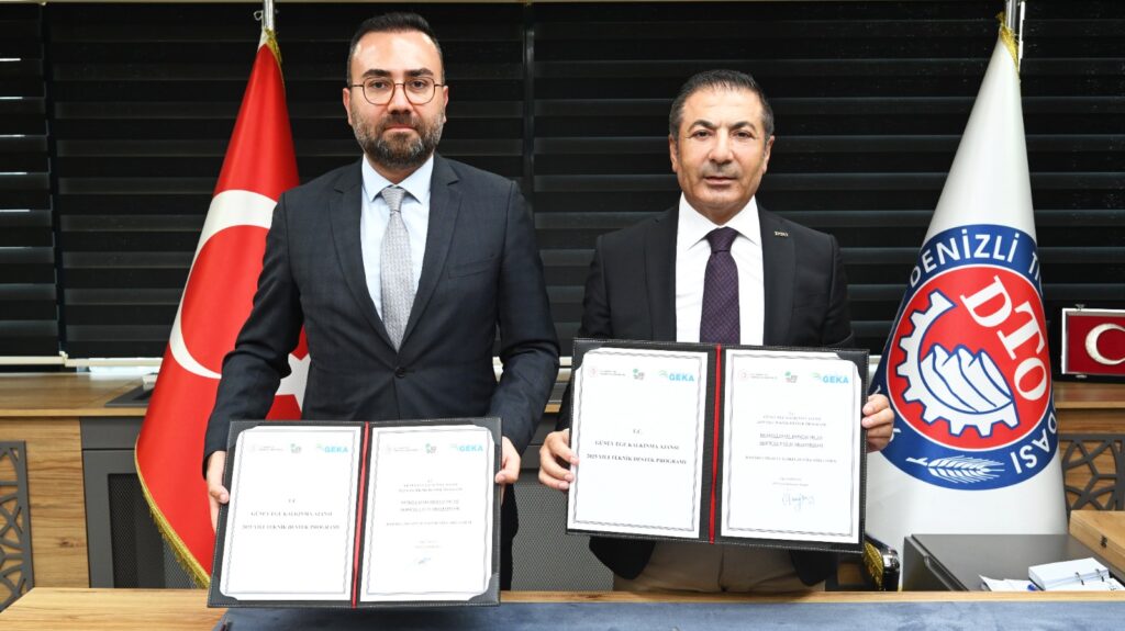 DTO’nun GEKA’ya sunduğu Denizli Yeşil Dönüşüme ve Sınırda Karbon Düzenleme Mekanizmasına Uyum Araştırması Projesi kabul edildi. Protokolünü, DTO Başkanlık makamında DTO Yönetim Kurulu Başkanı Uğur Erdoğan ile GEKA Genel Sekreteri Ümit Gülyağı imzaladı.
