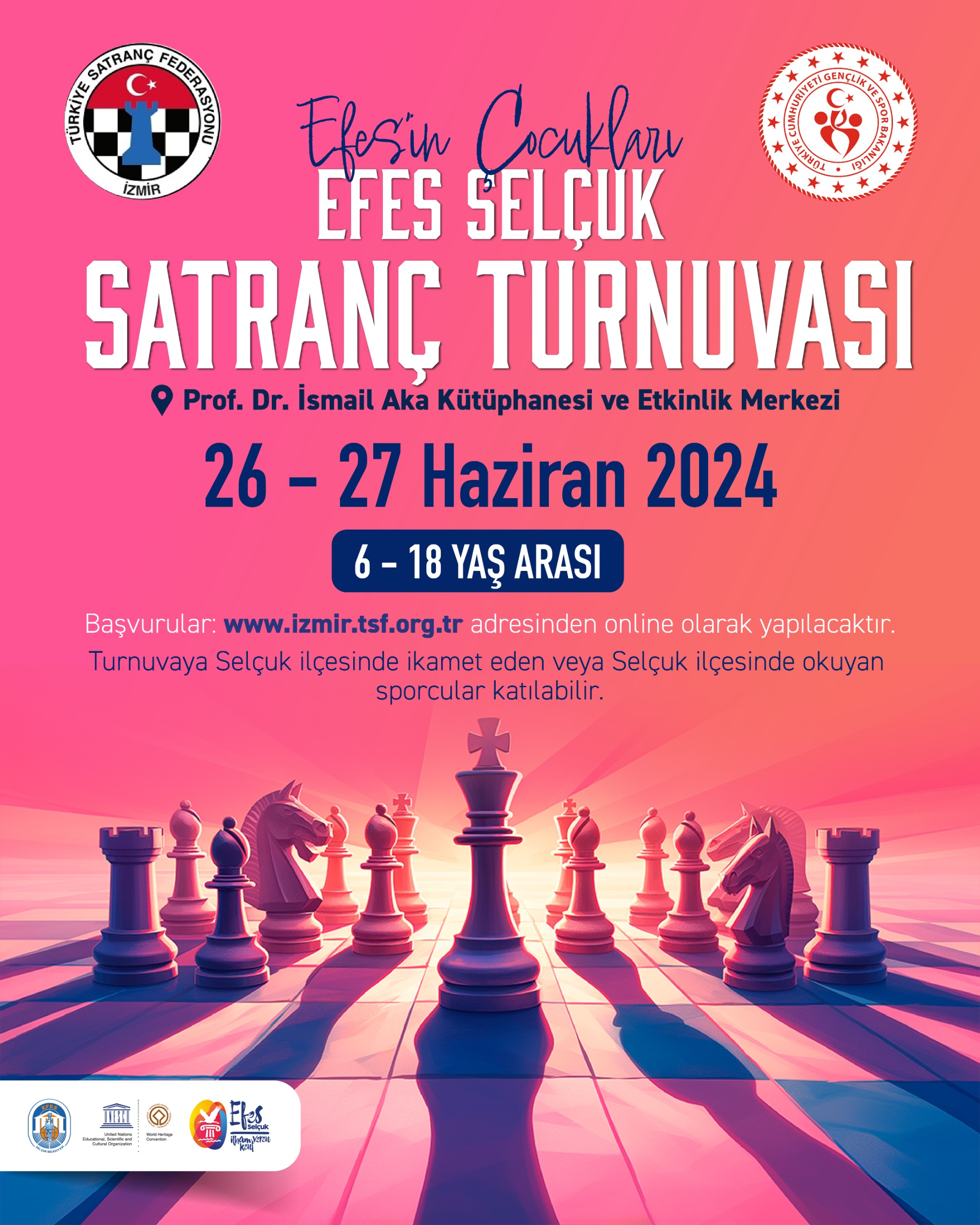 Satrancı gelecek nesillere sevdirmek ve çocukların hayatına dahil etmek amacıyla düzenlenen turnuva kapsamında başvurular http://www.izmir.tsf.org.tr/ adresi üzerinden online olarak yapılacak. Turnuvaya Efes Selçuk’ta ikamet eden ve Efes Selçuk’ta eğitim gören 6- 18 yaş arası çocuklar başvuru yapabilecek. 8,10,14 ve 18 yaş altı olmak üzere dört ayrı yaş grubu için düzenlenecek turnuva çerçevesinde ilk beşe giren, kızlarda ilk üçe giren çocuklara kupa verilecek. Turnuva kapsamında müsabakalar 26- 27 Haziran’da saat 10.00’da başlayacak.