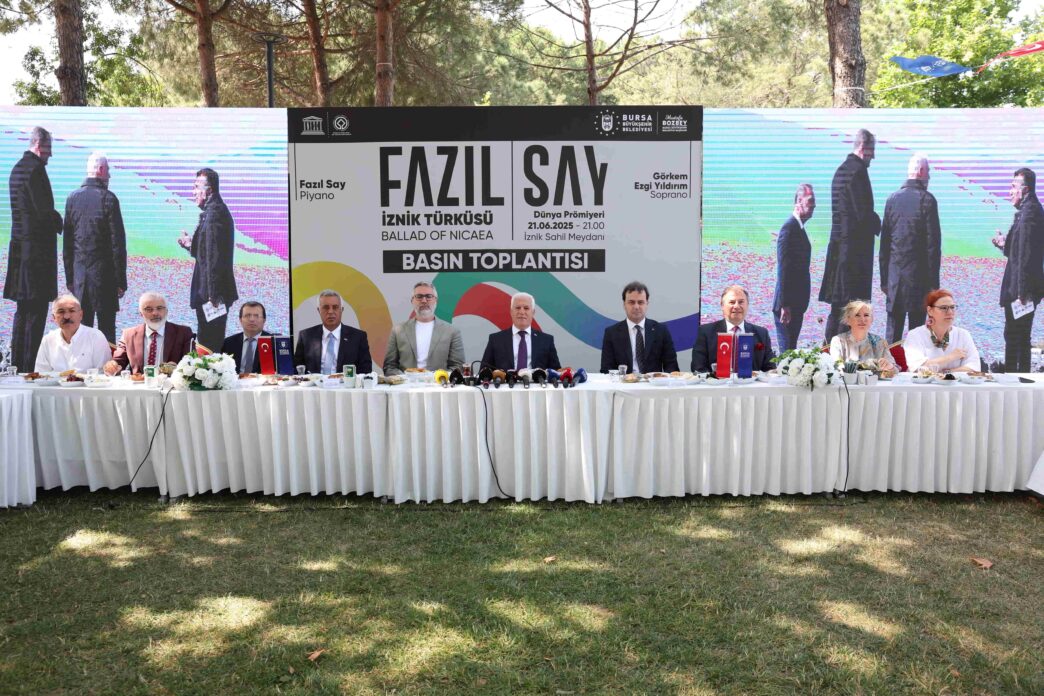 İznik’in sadece bir kent ya da önemli bir miras olmadığını söyleyen Başkan Mustafa Bozbey, çağlar boyunca pek çok medeniyete ev sahipliği yaptığını ve geçmişle bugünü buluşturan bir dünya merkezi olduğunu dile getirdi. İznik’in Helenistik dönemden Roma’ya, Bizans’tan Osmanlı’ya uzanan köklü geçmişiyle, pek çok kültürün bir araya geldiği eşsiz bir sentez olduğunu anlatan Başkan Bozbey, “Tarihin izlerini taşıyan yapılarıyla, gün yüzüne çıkan ve hâlâ keşfedilmeyi bekleyen antik mirasıyla, dünyada eşi benzeri olmayan kentlerden biridir. Bursa Büyükşehir Belediyesi olarak kentimizin güzelliklerini hak ettiği değere ulaştırmak en önemli hedefimiz. Bugün Fazıl Say’ın İznik Türküsü’nün dünya prömiyerini duyurarak, bu hedef doğrultusunda bir tuğla daha koyuyoruz. Bu eşsiz ve çok değerli eseri Bursamıza, İznik’e ve gelecek kuşaklara armağan eden değerli sanatçımız Fazıl Say’a teşekkür ediyorum. Fazıl Say, ‘İznik Türküsü’ aldı eseri Almanya başta olmak üzere birçok ülkede vereceği konserlerde seslendirecektir. Tüm dünya insanlarını, müziğin birleştirici gücünde buluşmak üzere İznik’e davet ediyorum. ‘İznik Türküsü’ adlı bu anlamlı eser, Fazıl Say ve Soprano Görkem Ezgi Yıldırım ile ilk kez seslendirilecek. Bu değerli ana, İznik Gölü’nün eşsiz manzarasında tanıklık etmeye ve bu özel konseri hep birlikte yaşamaya tüm sanatseverleri, Bursalıları ve kentimizi ziyarete gelenleri bekliyorum” diye konuştu.
