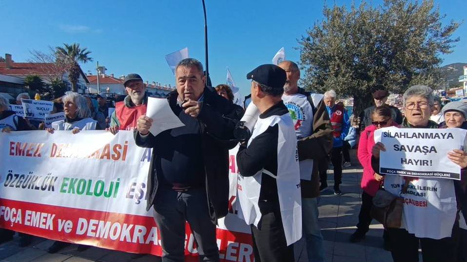 İzmir’in Foça İlçesi’nde aralarında bazı siyasi parti, çevre platformları ve sendika üyelerinin de bulunduğu Foça Emek ve Demokrasi Güçleri insiyatifi İran’a saldıran Amerika Birleşik Devletleri ve İsrail’i protesto eylemi yaptı. İktidarın’da bu devletlerle işbirliği içinde olduğunu iddia eden eylemciler Türkiye’deki Amerikan Üslerinin kapatılmasını, Nato’dan çıkılmasını ve İran’a yapılan saldırılara karşı olunduğunun açıkça ilan edilmesini istediler.