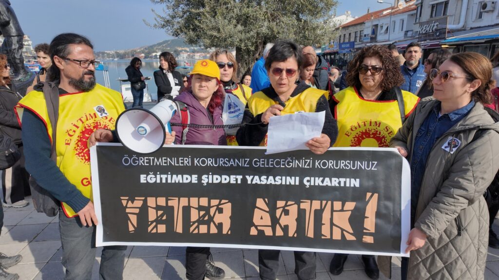 İzmir’in Foça İlçesi’nde Eğitim ve Bilim Emekçileri Sendikası (Eğitim –Sen) öncülüğünde düzenlenen basın açıklamasında okullardaki şiddet protesto edildi. Bir gün önce İstanbul’da bir meslektaşlarının okulda bıçaklı saldırıda hayatını kaybettiğini hatırlatan öğretmenler, okul güvenliği konusunda bütünlüklü, bilimsel ve katılımcı bir politikanın derhal hayata geçirilmesini istediler.