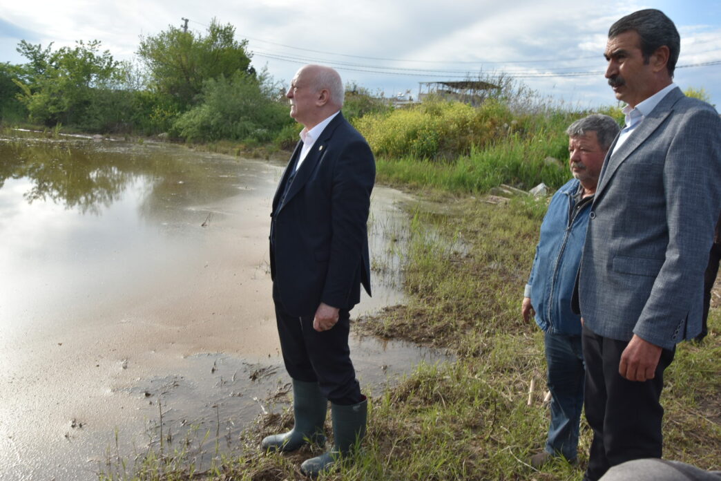 Veziroğlu Mahallesi’nde su altında kalan hububat tarlasında üreticilerle bir araya gelen Bayraktar, son yıllarda yaşanan doğal afetlerin tarım sektörünü ciddi şekilde etkilediğini söyledi.