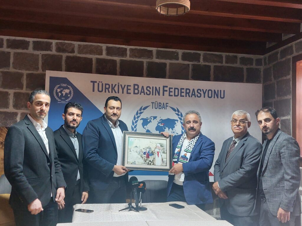 Türkiye’deki Filistinli Basın Mensupları Derneği heyeti, Türkiye Basın Federasyonu’nu ziyaret ederek Türk medyasına önemli bir çağrıda bulundu. Dernek Başkanı Dr. Amir Lafi başkanlığındaki heyette, Başkan Yardımcısı Dr. Zahir Elbek ile üyeler Nasır Hajjaj, Ömer Zaglol ve Ahmet Elasmar da yer aldı.
