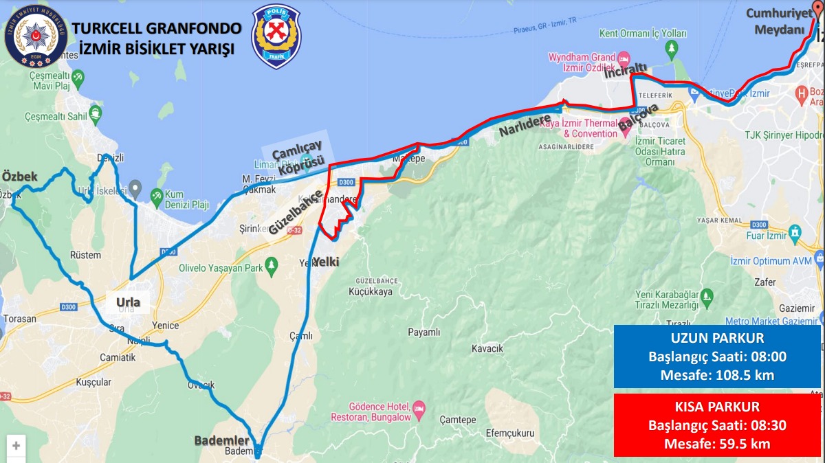 Gençlik ve Spor Bakanlığı’nın onayı ve İzmir Valiliği’nin izniyle 22 Ekim Pazar günü İzmir’de düzenlenecek Turkcell Granfondo İzmir 2023 Bisiklet Yarışı kapsamında, Konak’tan Urla’ya kadar uzanan rota, yarış saatlerinde trafiğe kapatılacak. 06.00-15.00 saatleri arasında, bölgedeki ESHOT otobüs hatlarının güzergâhlarında değişiklikler olacak. Üçkuyular Feribot İskelesi ise hizmet veremeyecek.
