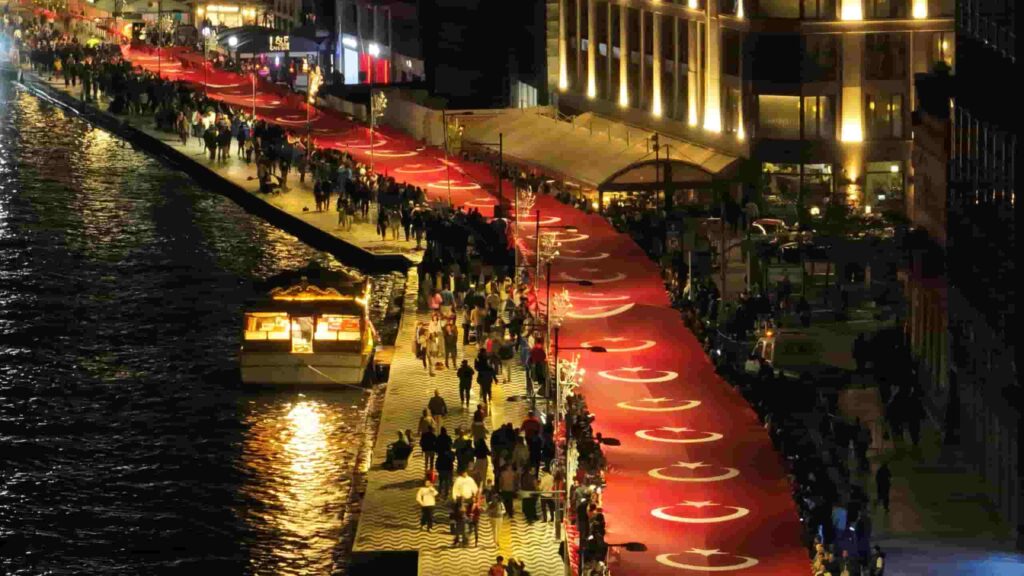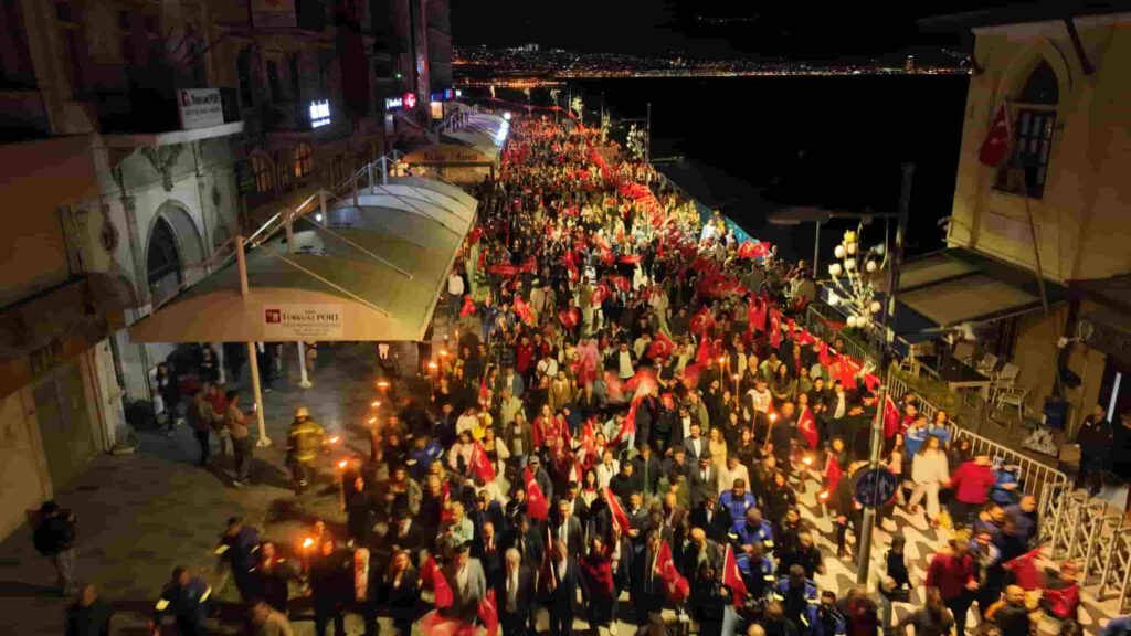 Kortej, Konak Pier önünde 350 metrelik Türk bayrağı ve fener alayı ile birleşti. Bandonun çaldığı marşlar eşliğinde kortej Cumhuriyet Meydanı’na doğru devam etti. Meydanda yapılan havai fişek gösterisi fener alayı yürüyüşüne renk kattı. Cumhuriyet coşkusu, saat 21.00’de Gündoğdu Meydanı’nda düzenlenen Haluk Levent konseri ile doruğa çıktı.