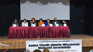 Cumhuriyet Kadınları Derneği İzmir Şubeleri’nin Karşıyaka Belediye Çarşı Kültür Merkezi’nde düzenlediği ‘Kadına Yönelik Şiddet ve Medya ‘ konulu panele Avukat Nuriye Kadan, , Gazeteci Deniz Doğan, Gazeteci Semi Tektaş, Gazeteci Rabia Nur Ağar, Şönim Kurucu Müdürü Güliz Kuli, Avukat Gökçe Çiçek Türkmen ve polis memuru Özgür Polat katıldı.