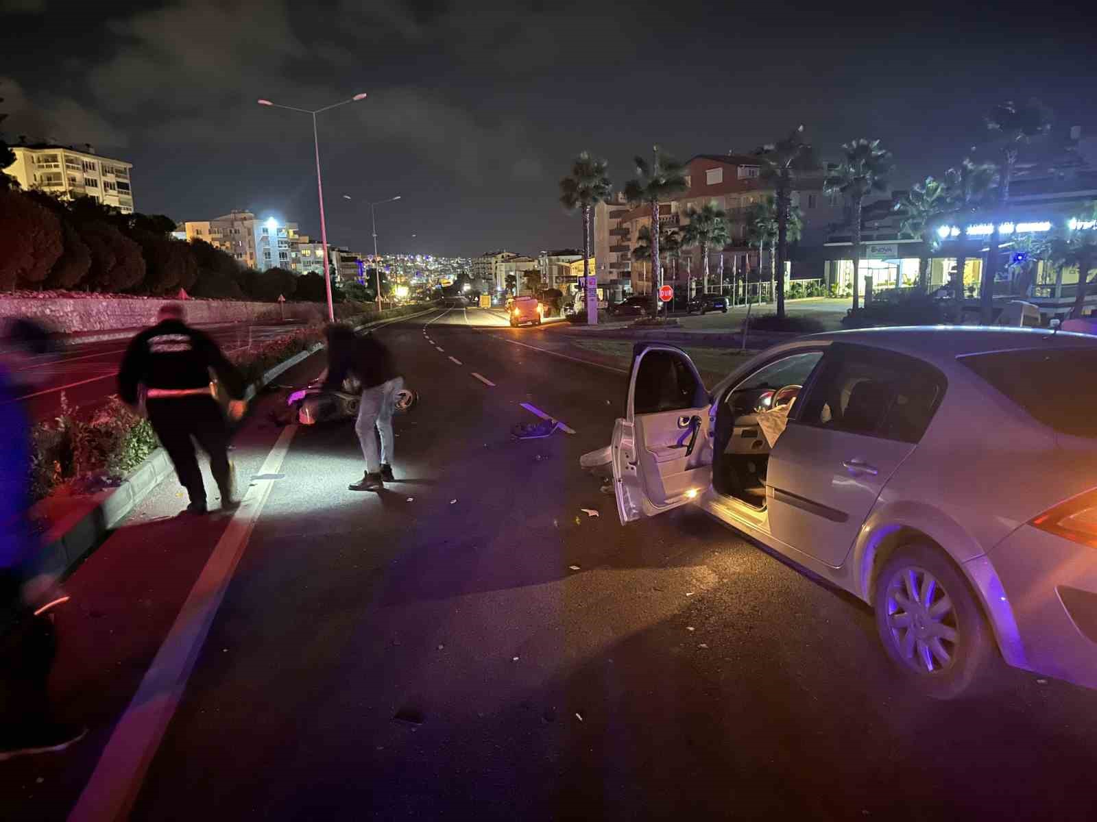 KUŞADASI’NDA KIRMIZI IŞIKTA GEÇEN OTOMOBİL MOTOSİKLETE ÇARPTI: 1 AĞIR YARALI (EKREM KESER/AYDIN-İHA)