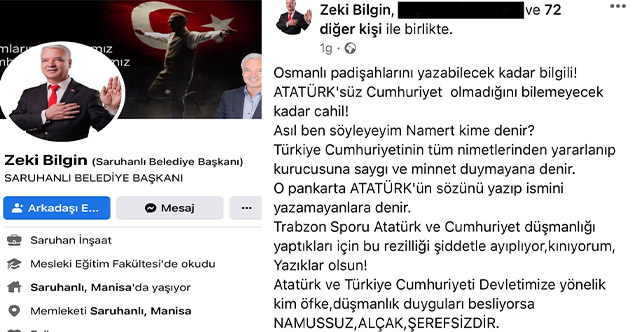 Manisa Saruhanlı Belediye Başkanı Sayın Zeki Bilgin Trabzonluları ve Trabzonsporluları; “ATATÜRK’süz Cumhuriyet olmadığını bilemeyecek kadar cahil!” şeklinde tanımlamış bir de üstüne “Trabzonspor’u, Trabzonspor camiasını ve Trabzonluları Atatürk ve Cumhuriyet düşmanlığı” yapmakla suçlamıştır.
