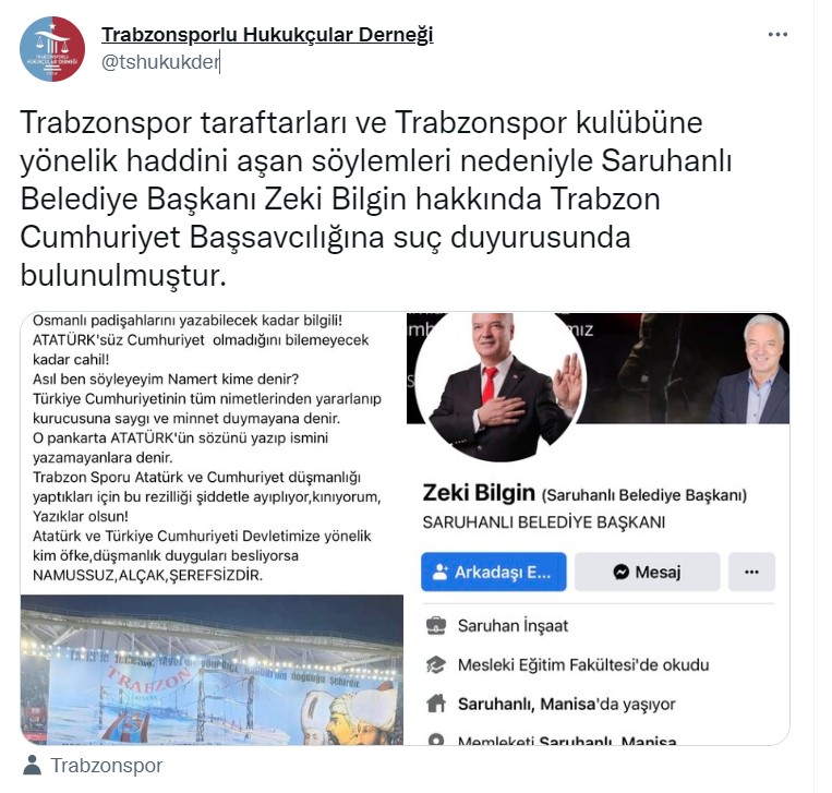 Saruhanlı Belediye Başkanı Zeki Bilgin’in bu açıklamaları üzerine Trabzonsporlu Hukukçular Derneği; Başkan Zeki Bilgin hakkında suç duyurusunda bulundu.