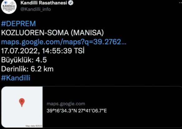 Kandilli Rasathanesi’nde yer alan verilere göre Manisa’nın Soma ilçesinde 4,5 büyüklüğünde deprem meydana geldi. Yerin 6,2 kilometre derinliğinde gerçekleşen deprem saat 14.55’te meydana geldi.
