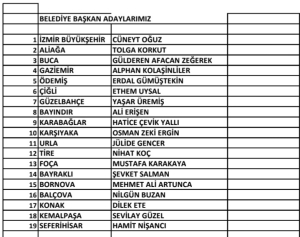Parti, İzmir Büyükşehir Belediye Başkan adayı olarak İl Başkanı Cüneyt Oğuz’u aday gösterirken, 18 ilçede de aday gösterdi.
