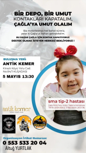13 aylık Çağla, hastaneye götürüldü ve bebeğe SMA Tip 2 teşhisi kondu. Bu süreçte Çağla, 6 yıl fizyoterapi desteği aldı, Aydın’ın Kuşadası ilçesinde yaşayan aile Dubai’deki yapılacak tedavi ile iyileşme olasılığı olan kızları için valilik onaylı kampanya başlatmıştı. Çağla’ya bir destekte motor tutkunlarından geldi.