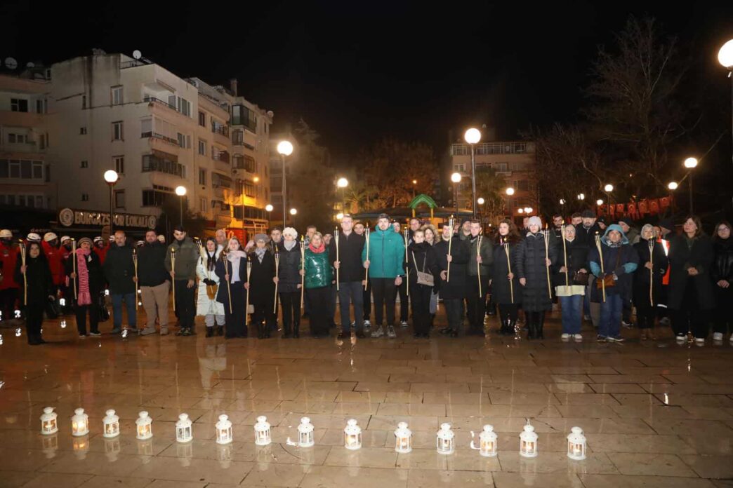 havaya aldırmadan anma törenine katılan Mudanyalılar mumlar ve meşaleler eşliğinde depremin