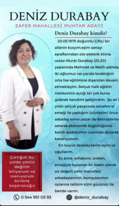 Selçuk’un Zafer mahallesi muhtar adaylarından Deniz Durabay da sorunları çözmek için görev beklediğini söyledi. Durabay, mahalleye yapılacak hizmetleri şimdiden planladığını ifade ederek, şöyle konuştu; “Tek amacım, yıllardır sorunlarla baş başa bırakılan Zafer mahallesine kalıcı hizmet sunmaktır. Belediye ile diyalog halinde olacağım. Ayrıca mahallemizin sosyal alanlara sahip olması için de girişimlerde bulunacağım. Daha güzel bir belde için Zafer mahallesi sakinlerinden destek bekliyorum.” dedi.