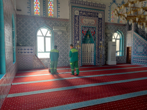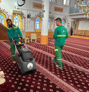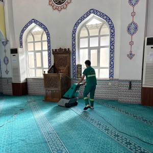 İlçe genelindeki tüm camilerde yürütülen temizlik çalışması kapsamında camilerdeki halılar, halı yıkama makinesi ve deterjanlı suyla yıkanırken; pencere, kapı, mihrap, minber, kürsü ve ayakkabılıklar büyük bir titizlikle siliniyor. Yüksek teknolojiye sahip makinelerle 90 derece sıcaklığa varan su ve özel deterjan kullanılarak yerinde yıkanan ibadethane halıları, aynı zamanda bakterilere karşı da dezenfekte ediliyor. Yıkandıktan sonra güçlü vakum sistemiyle kirli suyun çekilerek tahliye edildiği uygulamada ibadethaneler, daha hijyenik bir hale geliyor. Ayrıca cami içleri, şadırvanları ve ortak kullanım alanları ekipler tarafından dezenfekte ediliyor.