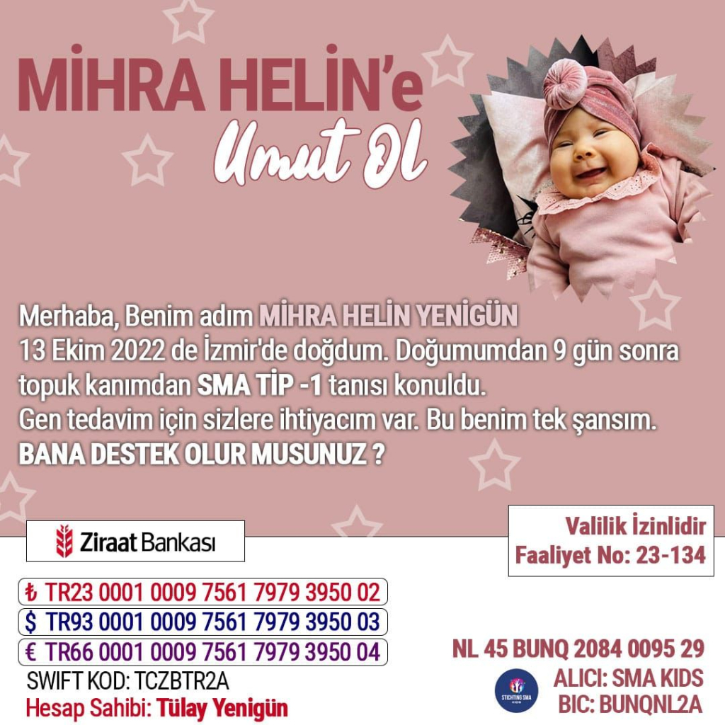 Türkiye’de tedavi olarak Sma’da şartları karşılayan çocuklara sprinza ilacı omurilikten uygulandığını belirten Tülay Yenigün “Fakat ‘Spinraza’ kesin çözüm değil. Bu ilaç sadece hastalığı yavaşlatıyor. Mihra’nın sağlığına kavuşması için Zolgensma tedavisi aldırmak zorundayız. Bu yüzden İzmir’in en küçük tanı alan bebeği olan kızımız Mihra Helin için 20.01.2023 tarihinde tamamen yasal valilik onaylı bir kampanya başlattık.’dedi.