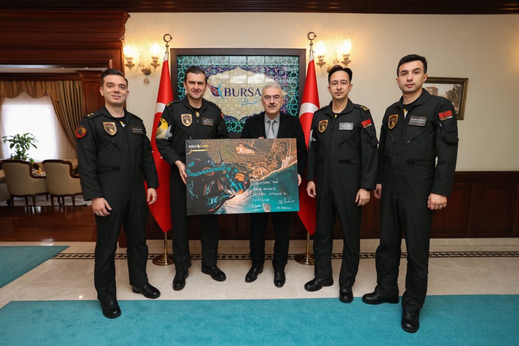 Bursa Uludağ Üniversitesinin 50. Yıl Etkinlikleri” kapsamında ilimizde gösteri uçuşu gerçekleştirecek SOLOTÜRK Gösteri Pilotu Binbaşı Murat Bakıcı ve Binbaşı M. Erhan Aydemir, Valimiz Sayın Erol Ayyıldız’ı ziyaret etti.
