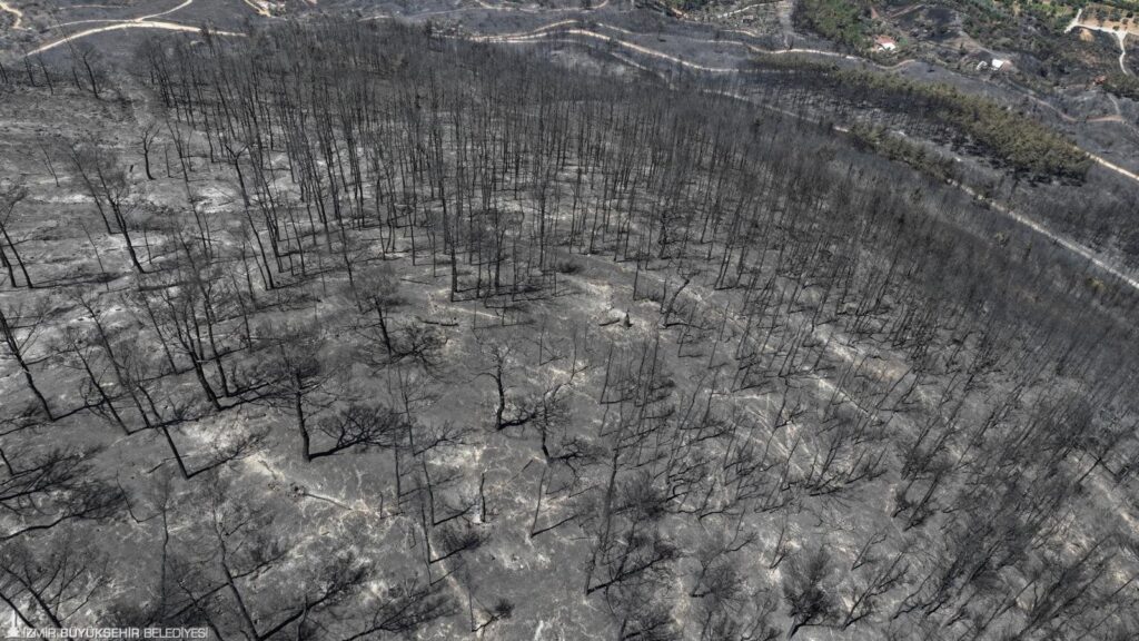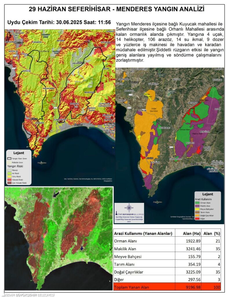 İzmir Büyükşehir Belediyesi Kent Bilgi Sistemleri Dairesi Başkanlığı da yangın bölgesinin uydudan görüntüsünü alarak değerlendirme yaptı. Buna göre 1922 hektarlık orman, 3 bin 241 hektarlık makilik alan, 155 hektarlık meyve bahçesi, 355 hektarlık tarım alanı, 3 bin 225 hektarlık çayır, 300 hektarlık da diğer alanlar olmak üzere yaklaşık 10 bin hektarlık alan (14 bin futbol sahası büyüklüğünde) küle döndü.