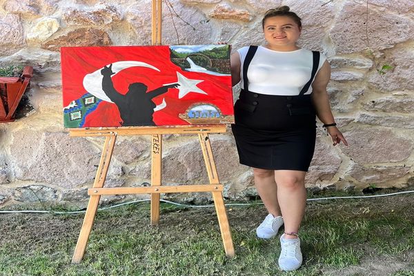 Bu tablo, sanatçı Bircan Demirtaş tarafından yapılmış ve Uşak iline ait önemli kültürel ve doğal unsuru bir araya getirerek güçlü bir yöresel anlatım sunuyor. Tablonun merkezinde kırmızı zemin üzerine yerleştirilmiş büyük bir Türk bayrağı motifi yer alıyor. Bu, kompozisyona hem güçlü bir ulusal kimlik hem de dramatik bir görsellik katıyor. Bayrağın ortasında, siyah siluet şeklinde betimlenen zeybek figürü bulunuyor ve elleri yukarıya doğru uzanmış, bu da coşku, gurur ve kültürel mirasa bağlılığı simgeliyor. Tabloda yer alan Uşak Zeybeği figürü ile Türk bayrağı, birlikte çok güçlü bir anlam ve duygu bütünlüğü oluşturuyor. Uşak Zeybeği Figürü Siluet şeklinde sunulmuş zeybek figürü, hem sade hem de etkileyici bir anlatım yöntemi. Siyah siluet, bireysel kimlikten sıyrılıp simgesel bir karakter haline geliyor; böylece tek bir kişiyi değil, tüm Ege halkını, hatta Anadolu’nun direniş ruhunu temsil ediyor. Zeybeğin pozu, klasik zeybek oyununa ait bir duruşu yansıtıyor: kollar açık, biri yukarı doğru kalkmış, göğüs dik. Bu duruş cesaretin, onurun, özgürlüğün ve bağımsızlığın sembolüdür. Zeybek, Anadolu insanının vakur duruşunun, kendi toprağında dimdik ayakta duruşunun ifadesidir. Uşak zeybeği, özellikle Ege bölgesinde oynanan bir halk oyunu olsa da, bu oyunun kökleri, Kurtuluş Savaşı yıllarına ve daha öncesine uzanır. Bu bağlamda figür, sadece bir dansı değil, bir direniş geleneğini ve halk hafızasını da temsil ediyor. Bayrağın arka plan olarak verilmesi, zeybek figürünün onunla bütünleştiğini ve ondan güç aldığını gösteriyor. Zeybeğin göğsünden çıkan, ona fon oluşturan bu bayrak, figürün milli kimliğini ve aidiyetini perçinliyor. Bayrağın dalgalanması ve figürün dinamik duruşu, birlikte bir hareket ve canlılık yaratıyor. Bu, sadece geçmişe dönük bir anma değil, aynı zamanda yaşayan, hâlâ süren bir ruhun temsili. Bu bağlamda bayrak, sadece bir simge değil, zeybeğin ruhunun, cesaretinin ve direnişinin kaynağı olarak sunulmuş. Zeybek ve bayrağın birleşimi, ulusal değerler ile yerel kültürün harmanlanmasını simgeliyor. Yerel bir halk oyunu olan zeybek, bu tabloda Türk milletinin tamamını temsil edecek bir anlam yüklenmiştir. Renk kontrastı da (kırmızı-beyaz ile siyah) bu güçlü mesajı pekiştiriyor. Zeybek figürünün siluet oluşu, izleyicinin kendi kimliğini bu figürle özdeşleştirmesine olanak tanıyor. Herkes o figürün yerine geçebilir: Herkes bu vatanın bir zeybeği olabilir. Bu tablo, Uşak zeybeği ile Türk bayrağını birleştirerek yerel kimliğin ulusal ruhla bütünleşmesini sanatsal bir dille anlatıyor. Figürün bayrak önünde dimdik ve gururla durması, geçmişin mirasına sahip çıkan, geleceğe kararlılıkla bakan bir duruşun sembolü. Hem kültürel zenginliğe hem de milli birliğe güçlü bir vurgu yapıyor.Uşak Kilimi: Sol alt köşede yer alan geleneksel Uşak kilimi motifleri, zengin desenleri ve canlı renkleriyle tabloya yöresel bir doku katıyor. Bu, bölgenin el sanatları kültürünü temsil ediyor.