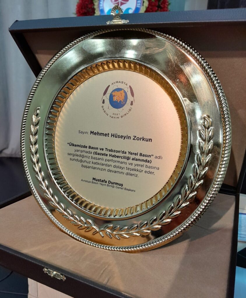 “Sayın Mehmet Hüseyin Zorkun, ‘Ülkemizde Basın ve Trabzon’da Yerel Basın’ adlı yarışmada (Gazete Haberciliği alanında) sergilediğiniz başarılı performans ve yerel basına sunduğunuz katkılardan dolayı teşekkür eder, başarılarınızın devamını dileriz.”