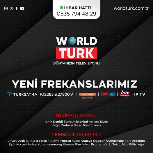 Dünyanızın Televizyonu WORLD TURK frekans değişikliğine giderek Türksat 4A, D_SMART ve Digital platformlarda yayın hayatına devam ediyor…