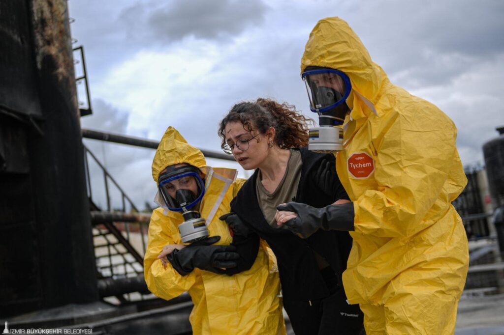 Tatbikata İzmir İl Afet ve Acil Durum Müdürlüğü (AFAD) ekipleri de katıldı. Senaryo gereği itfaiye ekipleri endüstriyel yangın eğitim simülasyonunda da alevlere müdahale etti. Panik ve heyecan duygularının aynı anda yaşandığı tatbikatta, AFAD koruyucu kıyafetleri ile tehlikeli kimyasal maddeden etkilenenleri kurtararak güvenli bölgeye aldı.