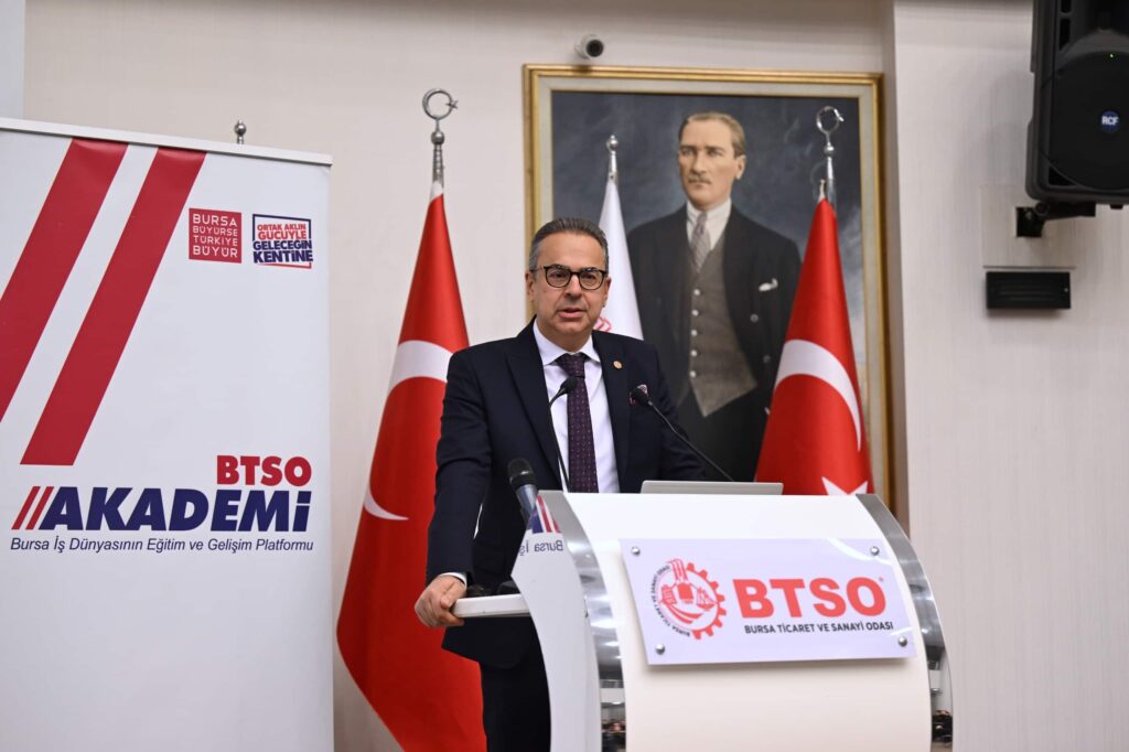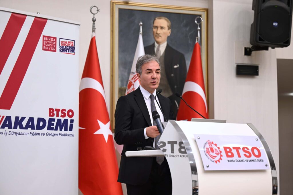 İş dünyasının eğitim ve gelişim platformu BTSO Akademi kapsamında İklim Değişikliği Başkanlığı ile birlikte gerçekleştirilen toplantı BTSO Yönetim Kurulu Üyesi Hakan Batmaz, BTSO Meclis Üyeleri ve iş dünyası temsilcilerinin yoğun katılımıyla düzenlendi. Programda İklim Değişikliği Başkanlığı Başkan Yardımcısı Mehrali Ecer ve alanında uzman isimler, Yeşil Dönüşüm ve Sınırda Karbon Düzenleme Mekanizması ve Ulusal Taksonomi, Sanayide Yeşil Dönüşüm ve Yeşil Dönüşüm Finans Araçları gibi önemli konularda bilgiler verdi. Programın açılışında konuşan BTSO Yönetim Kurulu Üyesi Hakan Batmaz, BTSO Akademi Projesi ile şimdiye kadar 700’ün üzerinde düzenlenen eğitim organizasyonlarından yaklaşık 110 bin BTSO üyesinin faydalandığını söyledi. Batmaz, söz konusu eğitim programlarında iş dünyasını ticarette yaşanan değişim ve dönüşüm sürecine hazırlamak istediklerini ifade etti.