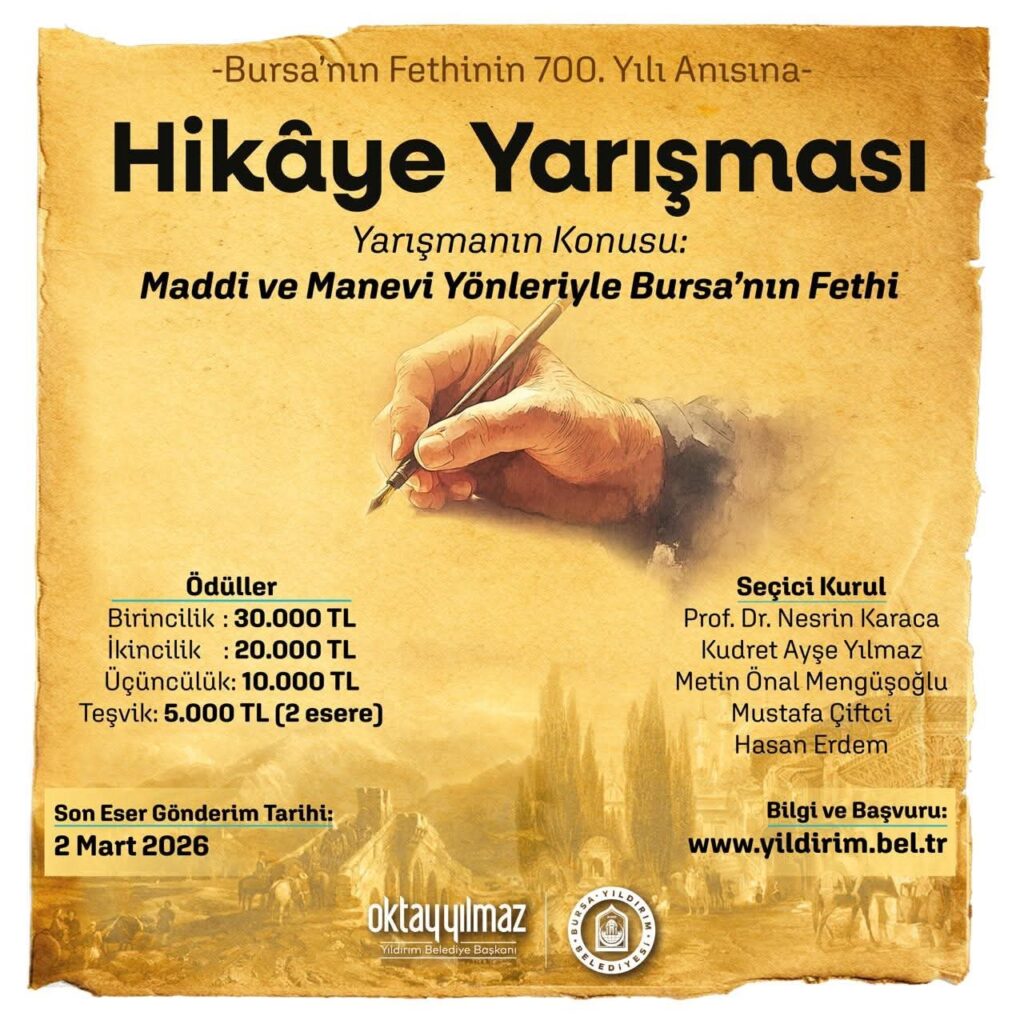 Yıldırım Belediyesi, Bursa’nın fethinin 700. yılını anlamlı bir şekilde anmak amacıyla iki ayrı alanda yarışma düzenliyor. Hikâye ve minyatür dallarında gerçekleştirilecek yarışmalarda, katılımcılar Bursa’nın fethini hem maddi hem de manevi yönleriyle ele alacak. Tarihî derinliği ve kültürel zenginliğiyle öne çıkan Bursa’nın fethini farklı açılardan gündeme taşımayı amaçlayan yarışmalar, edebiyatın etkileyici anlatım gücüyle minyatür sanatının zarif dokunuşlarını bir araya getiriyor.